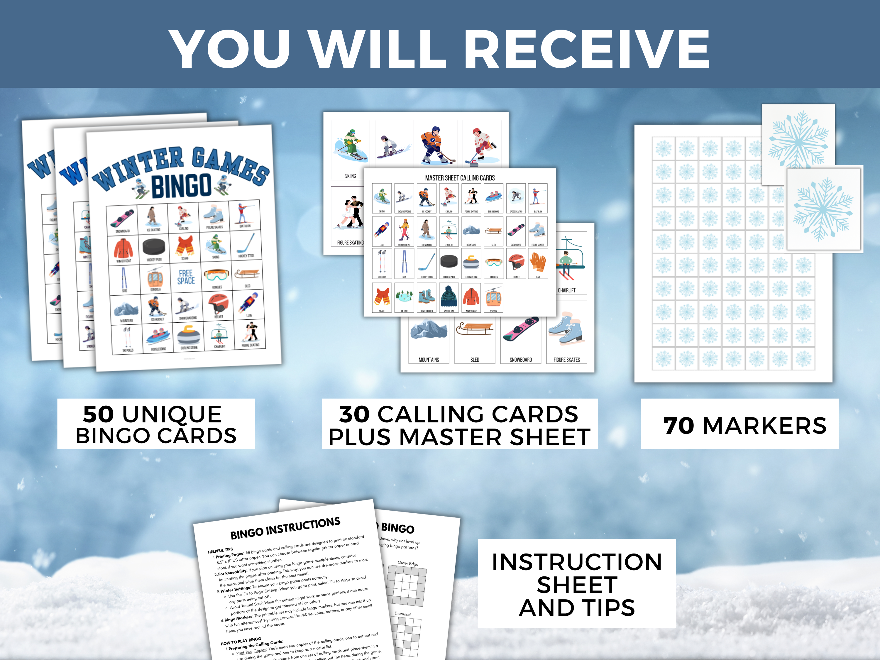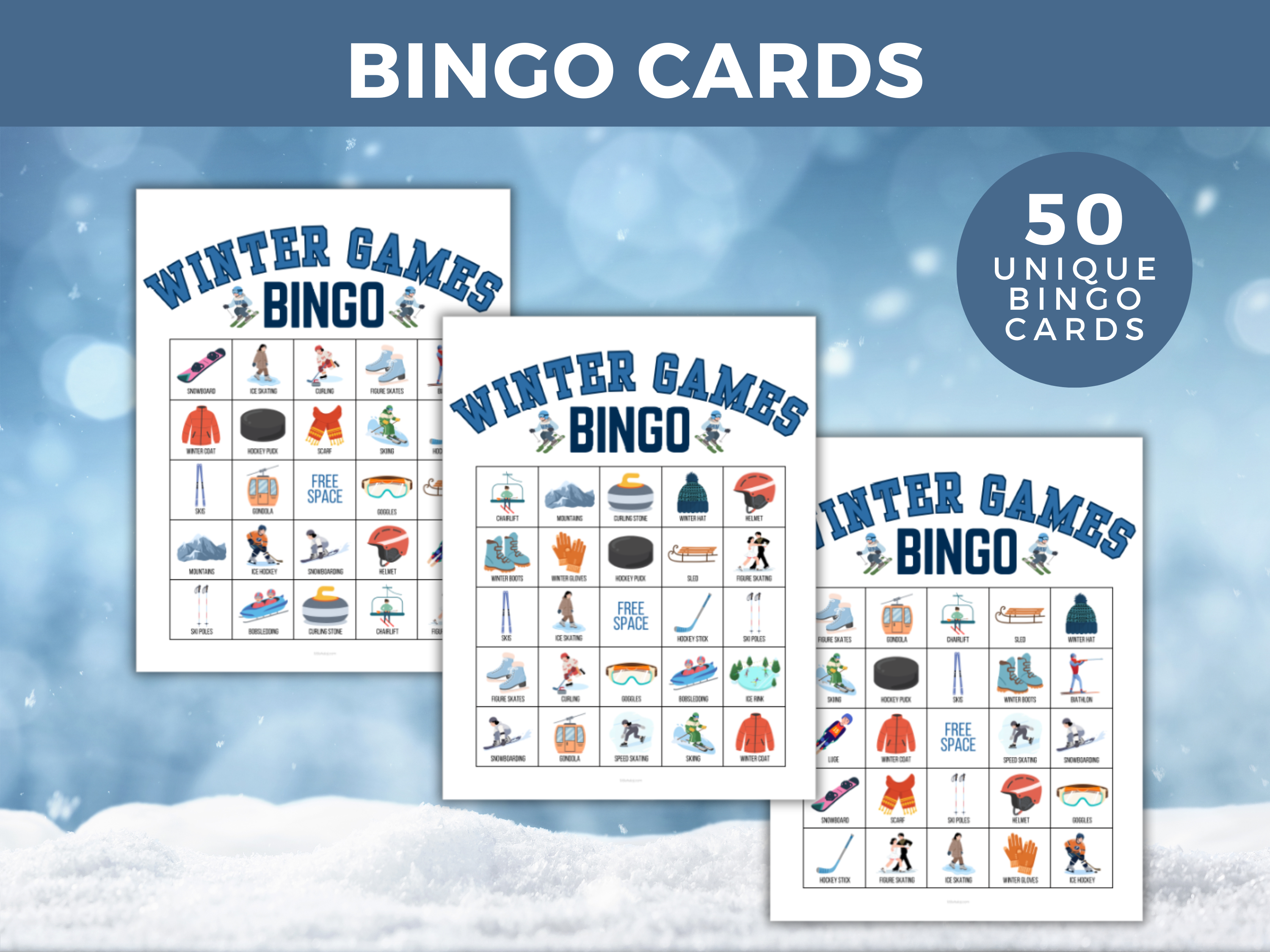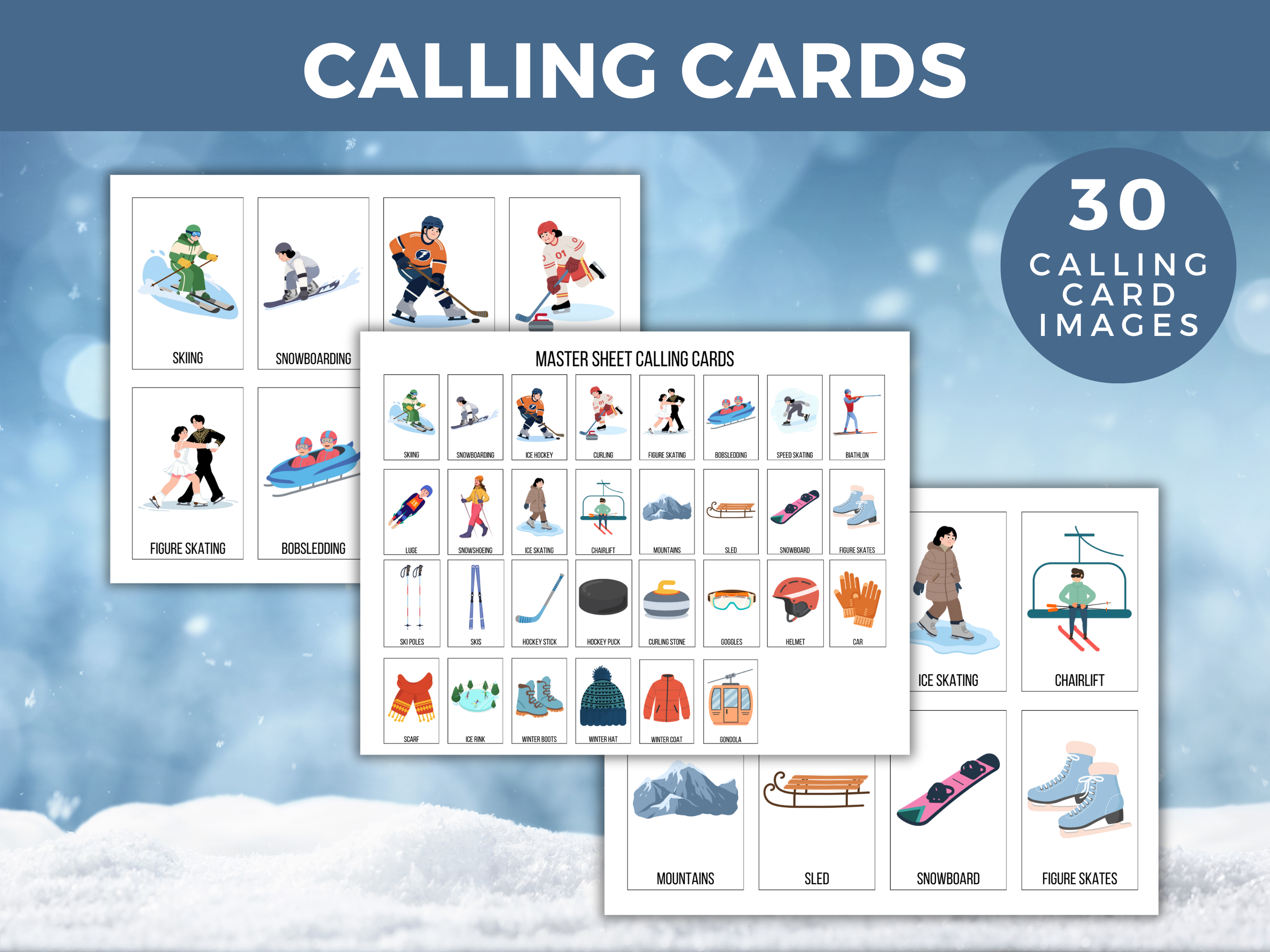 5 Pages of Calling Cards: Filled with all the winter games-themed items you need to bring your bingo game to life!