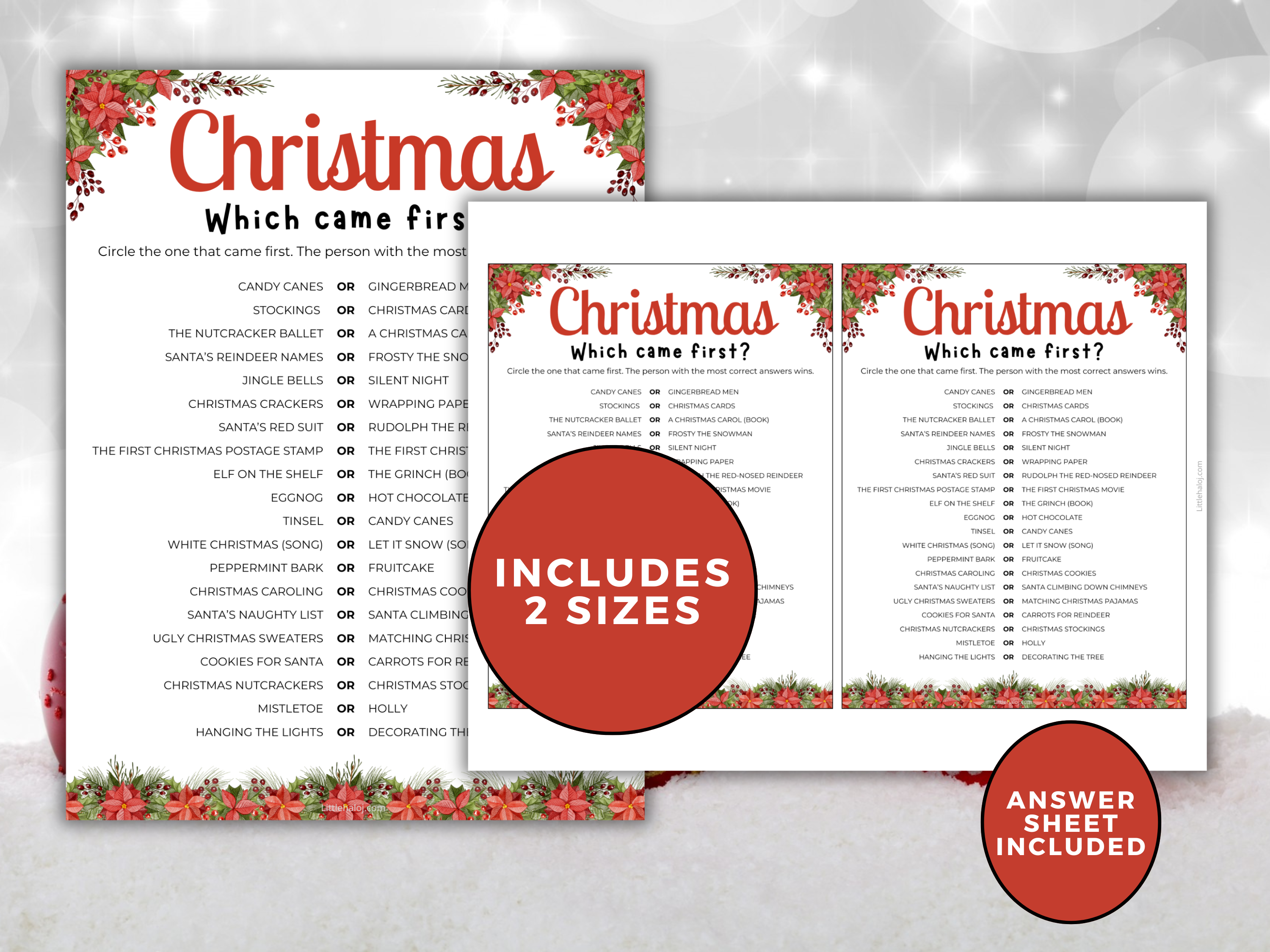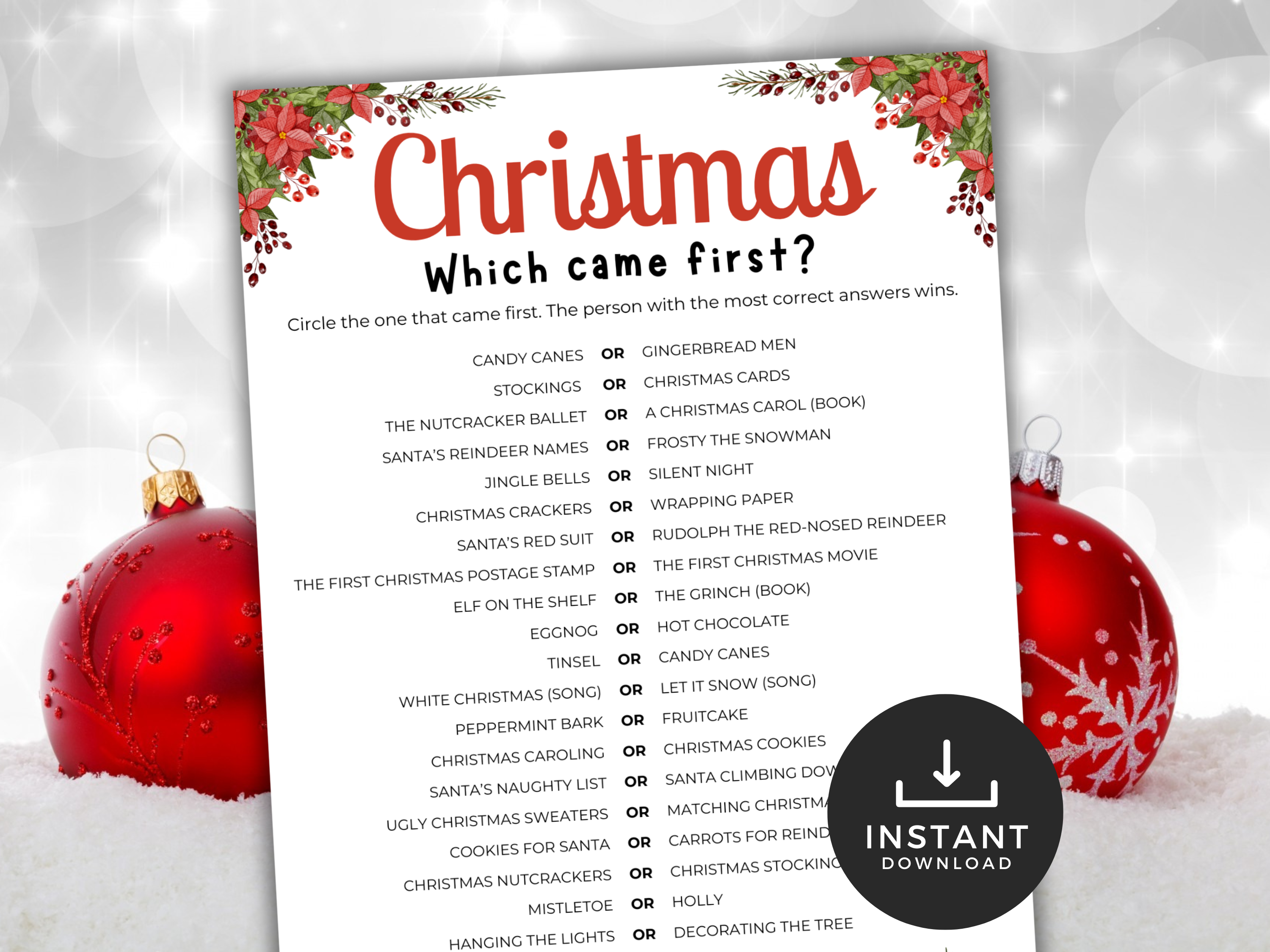This engaging printable activity challenges players to guess which Christmas-themed item, tradition, character, or holiday icon came first. Itโs a fun this-or-that style quiz complete with an answer key, making it perfect for friendly competition and festive learning!