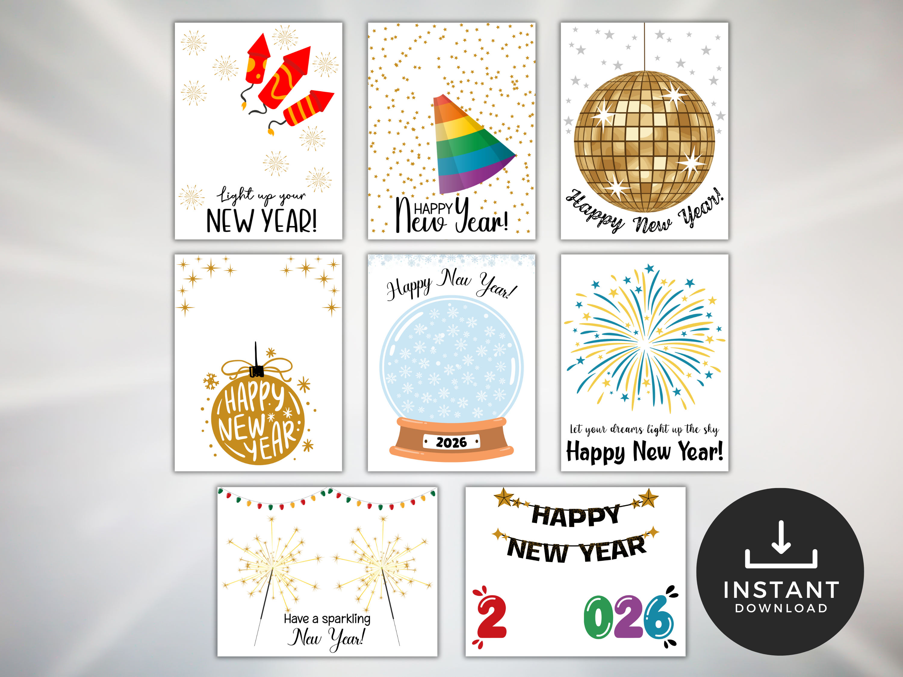 8 unique New Year-themed designs, including fireworks, party hats, balloons, confetti, and more!