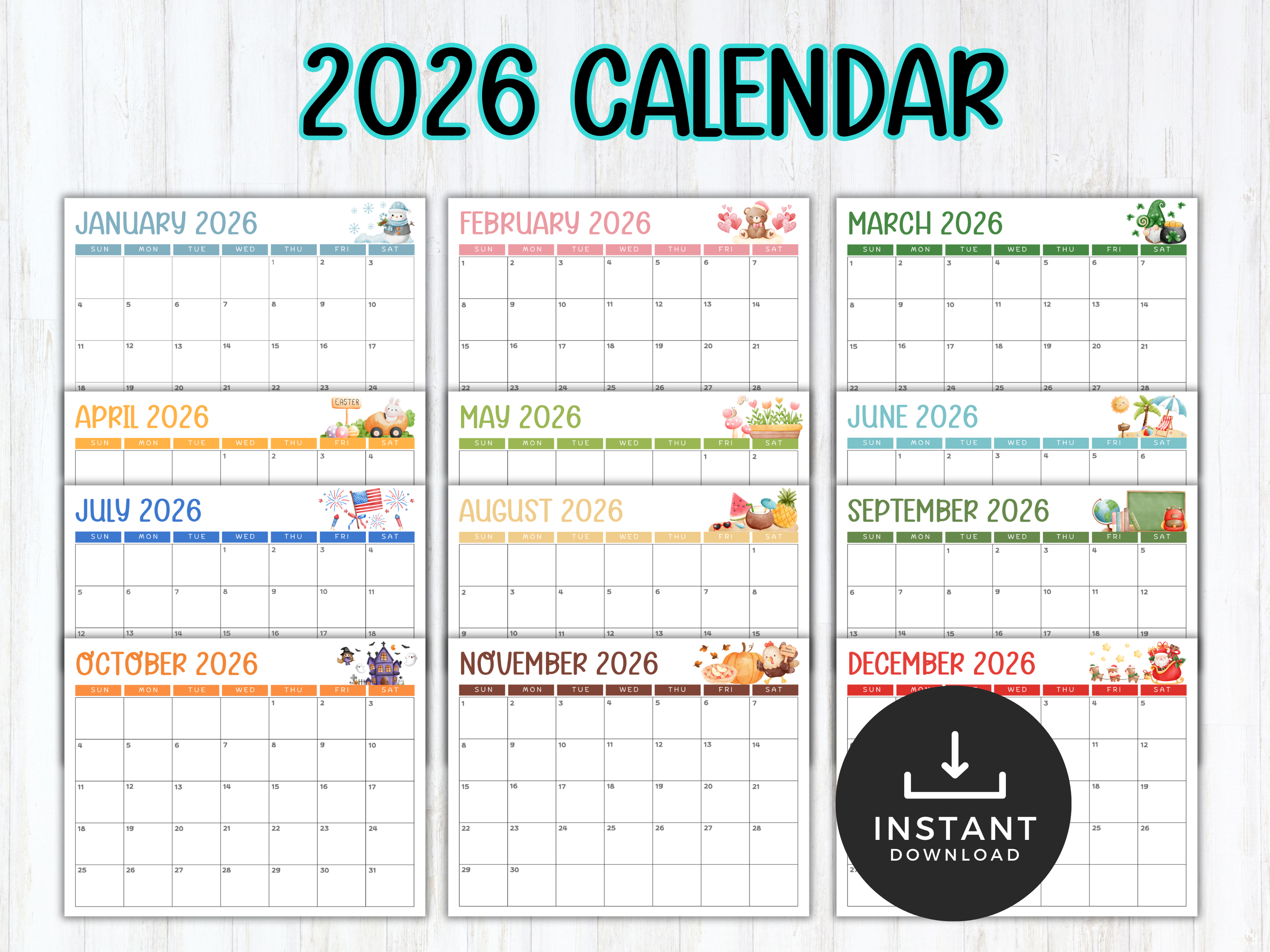 Make planning fun all year long with this 2026 Kids Calendar! Designed especially for children, this playful calendar features bright colors, cheerful illustrations, and a simple layout that’s easy for kids to read and use.