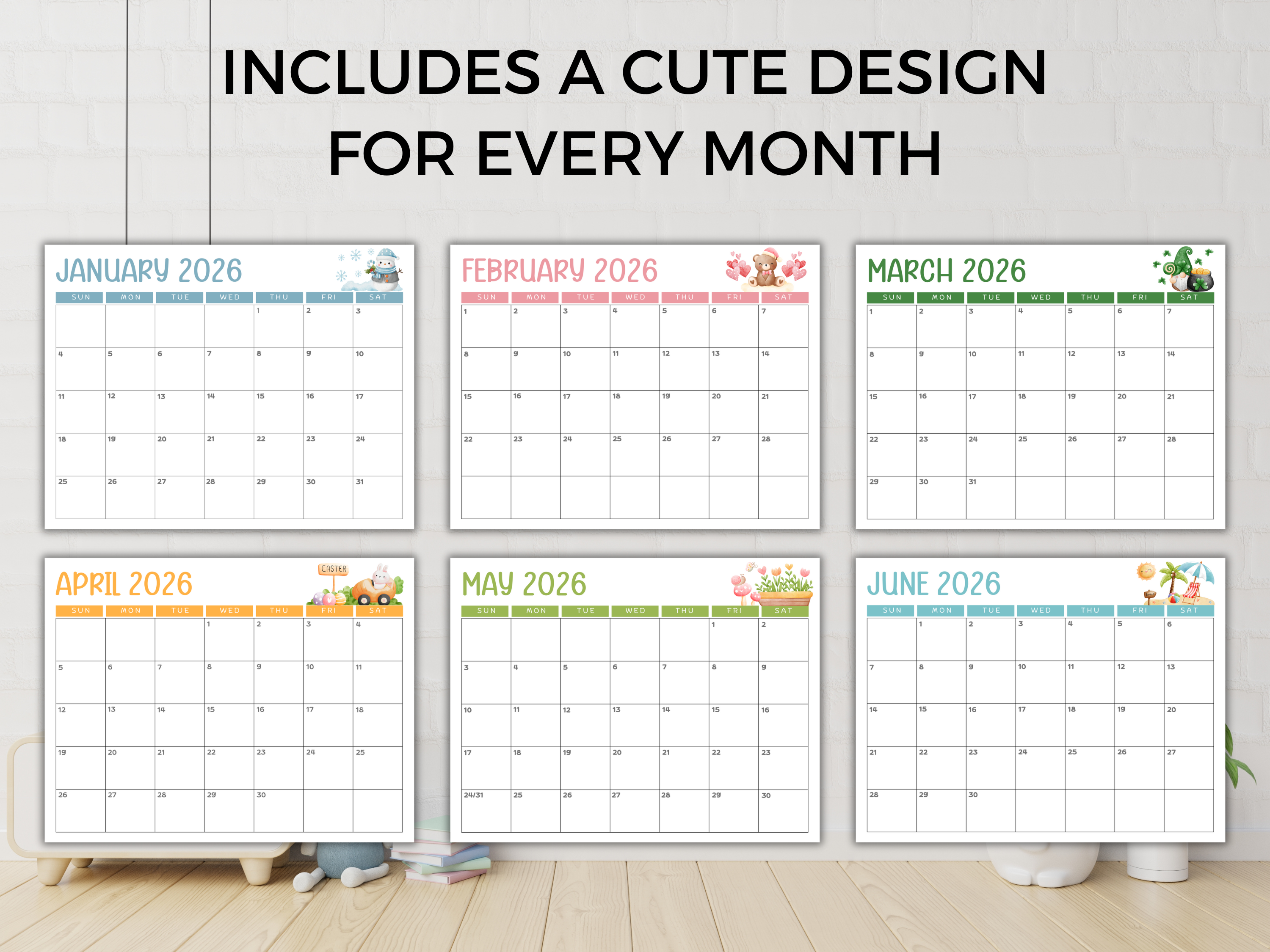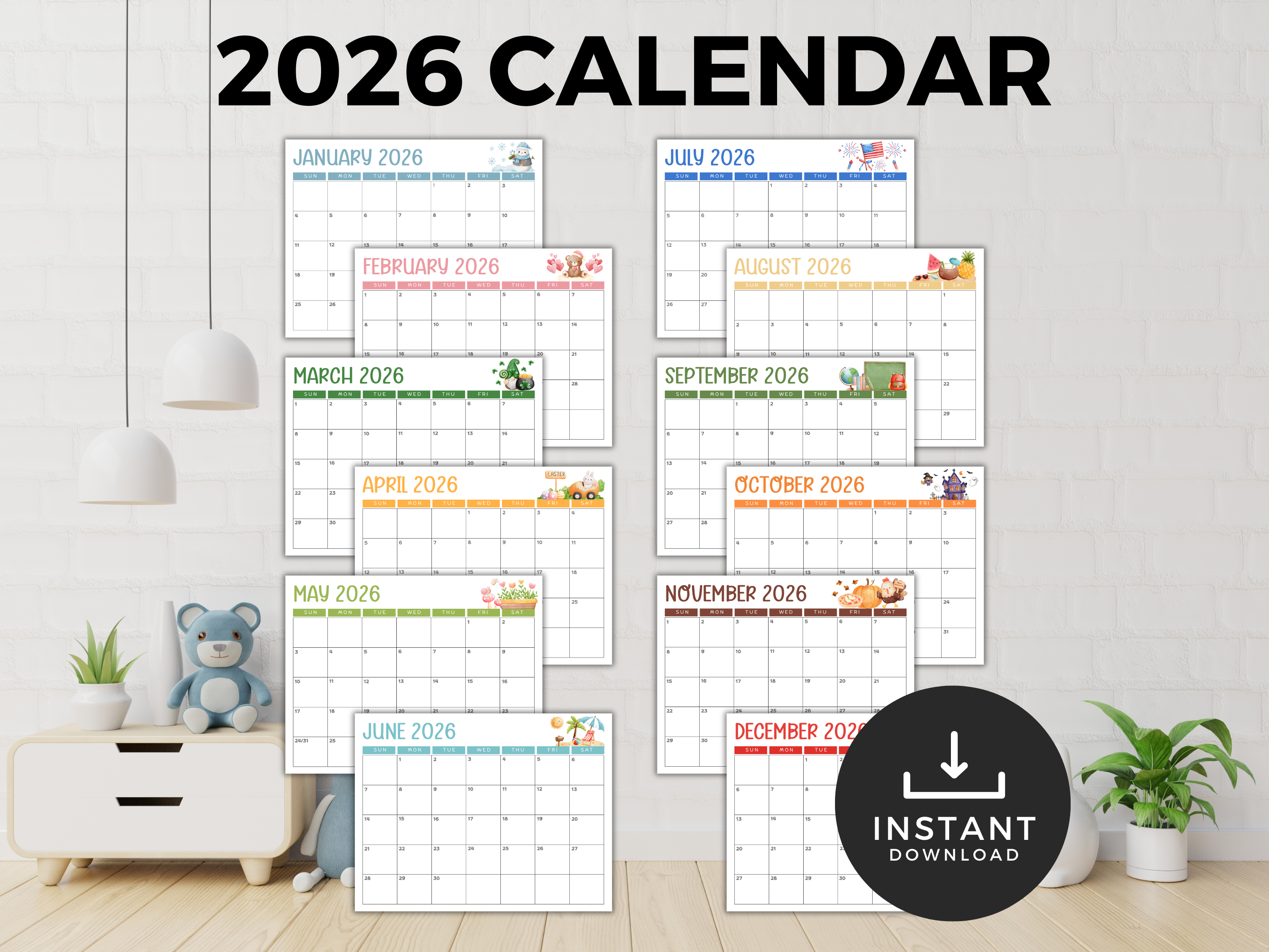 Perfect for helping children learn about months, dates, and routines, this calendar makes staying organized fun, whether it’s tracking school days, activities, birthdays, or special events from January through December 2026.