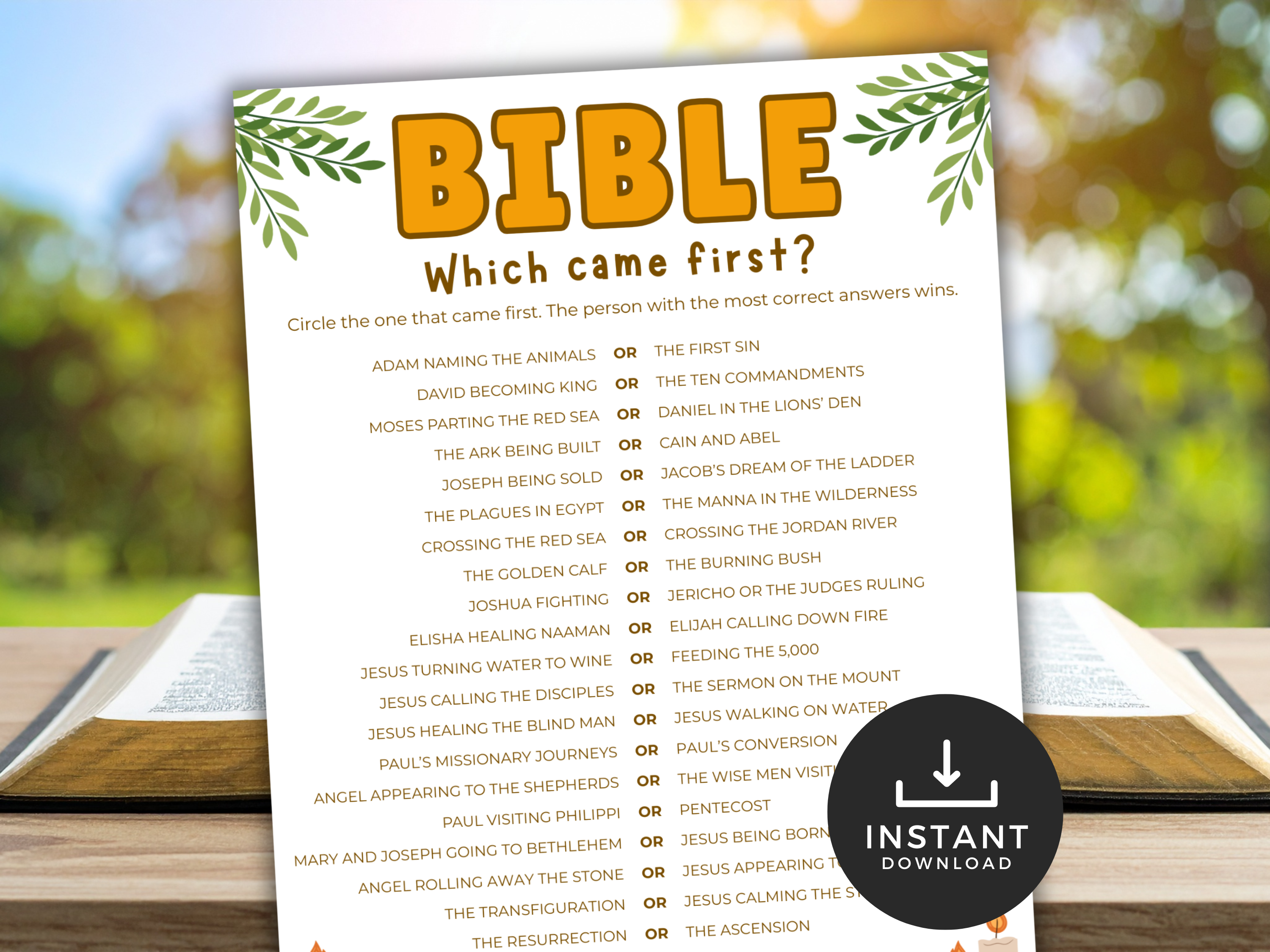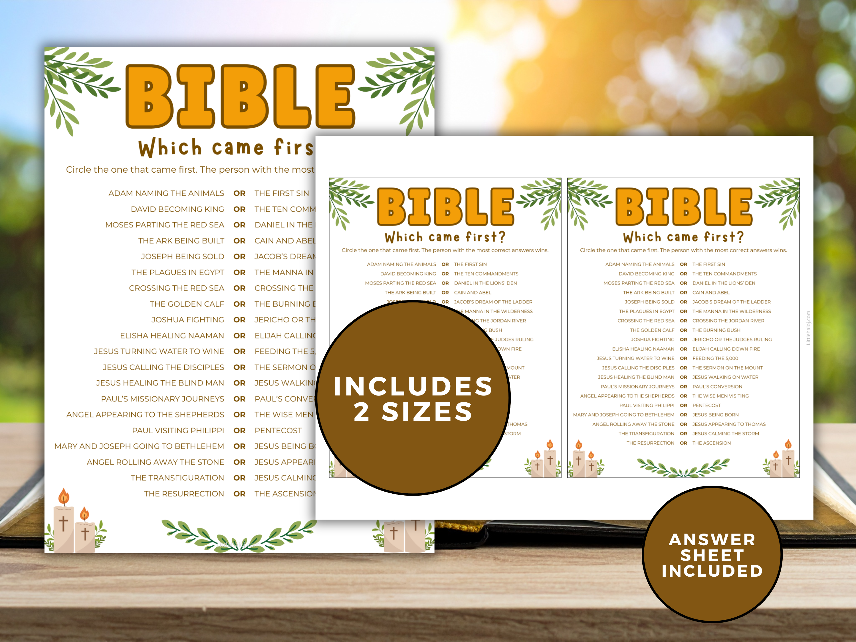 This engaging printable activity challenges players to guess which Bible person, event, miracle, or story happened first. It’s a fun this-or-that style quiz complete with an answer key, making it perfect for friendly competition and learning about Scripture!