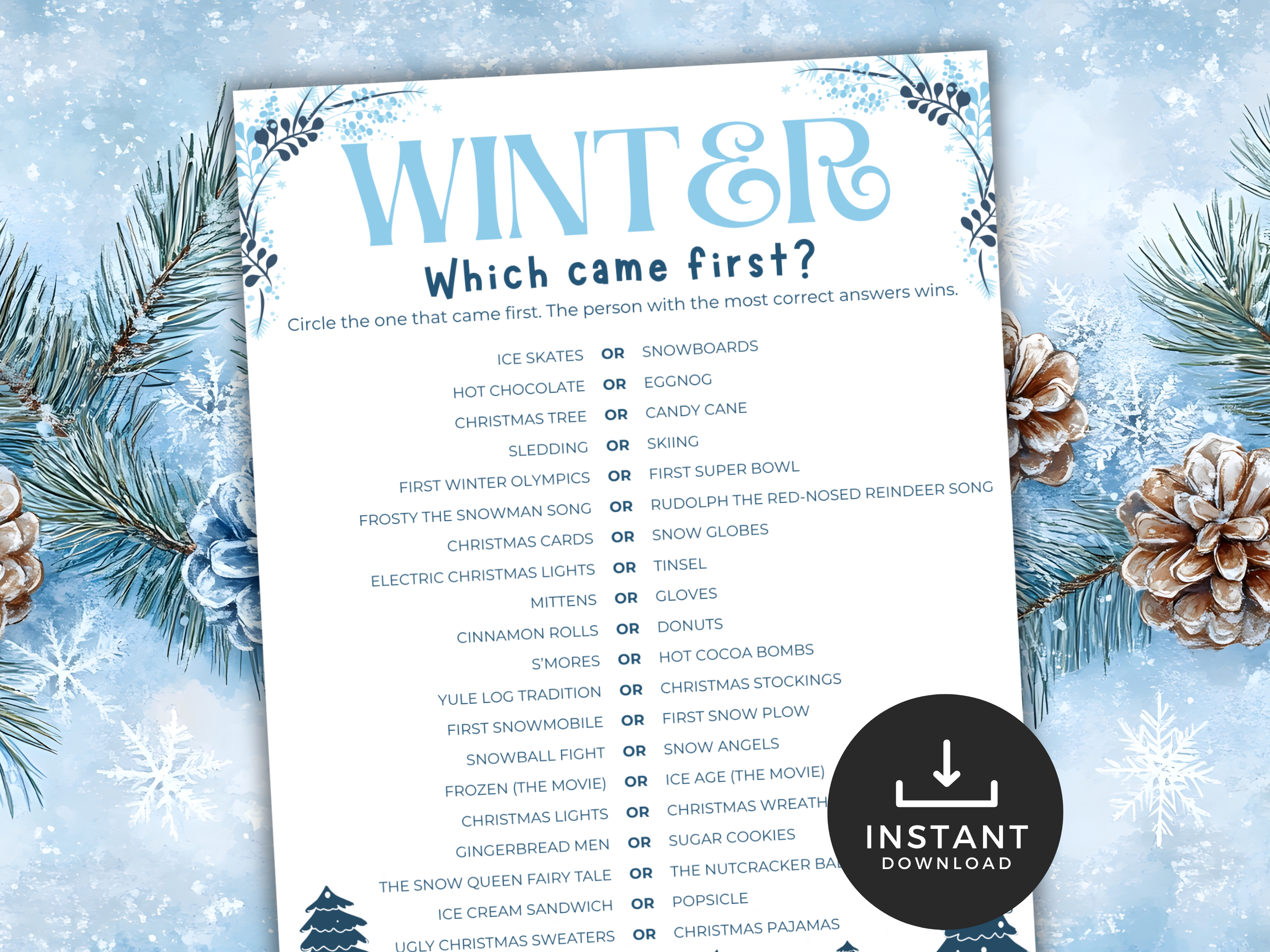 This fun printable activity challenges players to guess which winter-themed item, event, tradition, or icon came first. Itโs a fun this-or-that game with answer key, making it great for friendly competition and seasonal learning!